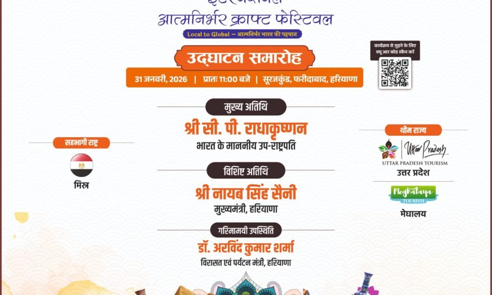 सूरजकुंड अंतर्राष्ट्रीय शिल्प महोत्सव का उद्घाटन करेंगे उपराष्ट्रपति सी.पी. राधाकृष्णन, पंजाब के युवाओं से संवाद में बोले सीएम नायब सिंह सैनी चंडीगढ़/फरीदाबाद।माननीय उपराष्ट्रपति सी.पी. राधाकृष्णन सूरजकुंड...