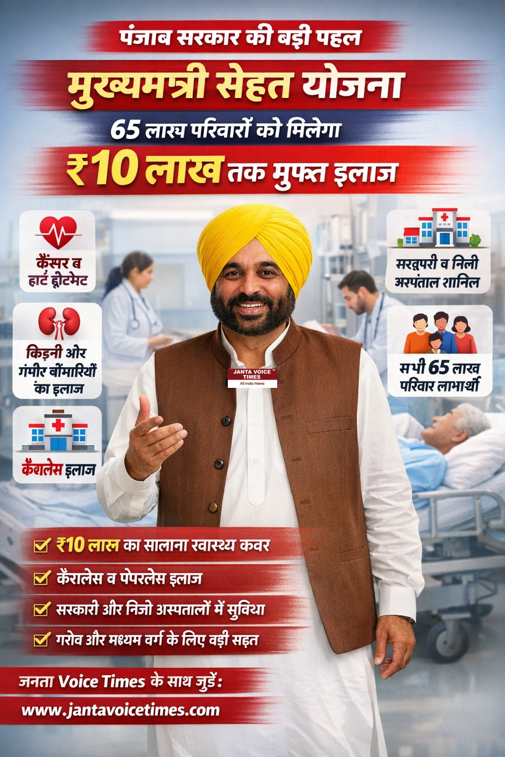 पंजाब सरकार ने स्वास्थ्य क्षेत्र में एक ऐतिहासिक और जनकल्याणकारी कदम उठाते हुए मुख्यमंत्री सेहत योजना की शुरुआत की है। इस योजना के तहत राज्य के 65 लाख से अधिक परिवारों को हर साल ₹10 लाख तक का मुफ्त स्वास्थ्य बीमा कवर प्रदान किया जाएगा। यह योजना न केवल गरीब और मध्यम वर्ग के लिए राहत लेकर आई है, बल्कि यह पंजाब को यूनिवर्सल हेल्थ कवरेज की दिशा में अग्रसर भी करती है।