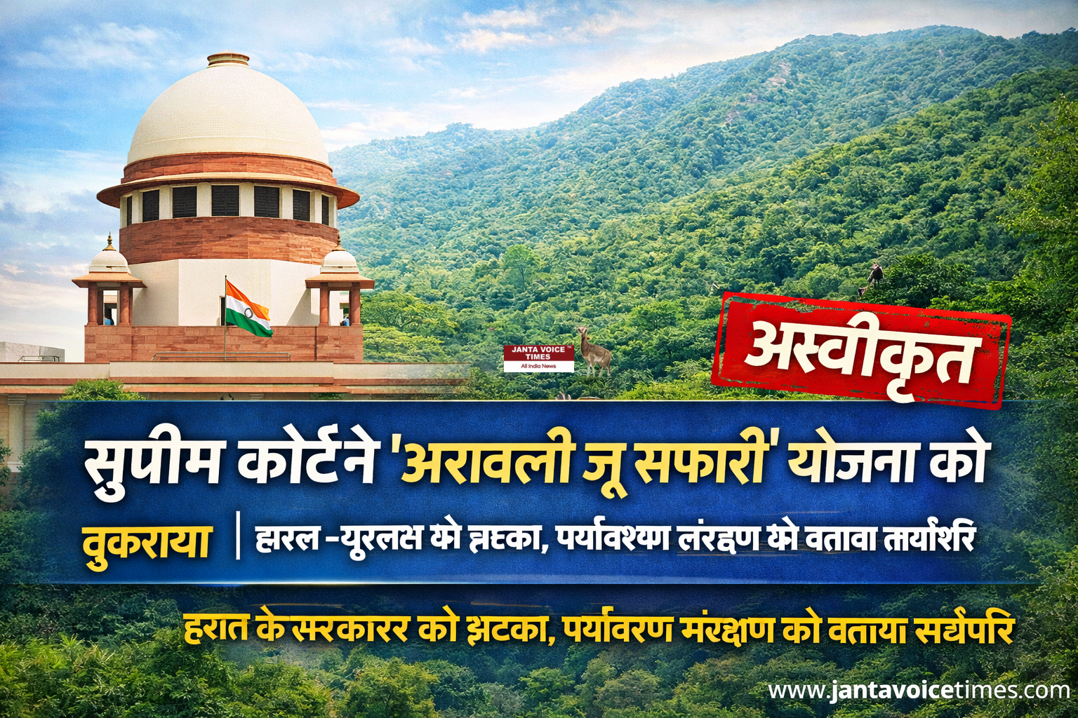 भारत के सर्वोच्च न्यायालय Supreme Court of India ने हरियाणा सरकार की अरावली क्षेत्र में प्रस्तावित जू-सफारी (जंगल सफारी) योजना को मंज़ूरी देने से साफ इनकार कर दिया है। अदालत ने अपने सख्त रुख में कहा कि अरावली की जैविक और पारिस्थितिक पहचान से किसी भी तरह का समझौता स्वीकार नहीं किया जा सकता, क्योंकि इसका सीधा और गहरा असर पर्यावरण, वन्यजीव संरक्षण और प्राकृतिक संतुलन पर पड़ेगा।